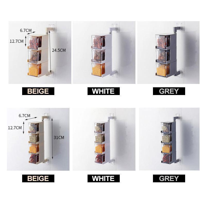 The 360-degree rotating design with 3 / 4 layers can help you hook 3 / 4 seasonings boxes at the same time. It can save more space.