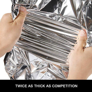 ► LARGE & DUAL REFLECTIVE SURFACE – Dimensions of 82” x 52” can accommodate up to 6’ 5” tall adults, very light 2oz each, effective addition to your thermal control gear, reflects back up to 90% of your body heat, 12-micron aluminized polyethylene mylar, resistant, windproof, waterproof, moisture proof, dual reflective sides for rescue signaling.