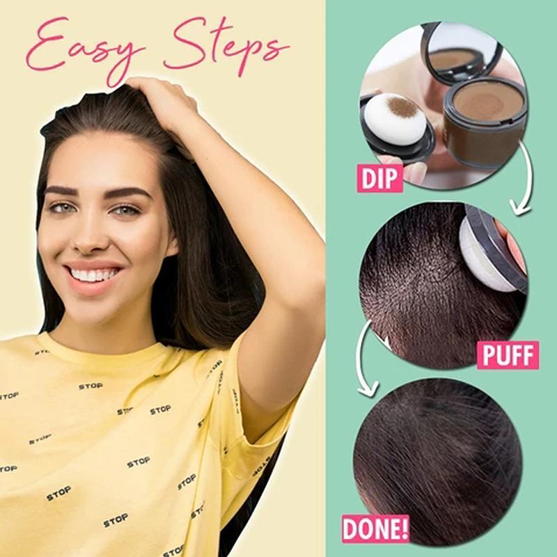 Open the puff in the bottom dipped in the amount of hair powder, along grey hair line root dipped gently tap, fill out the color of the neat hairline.