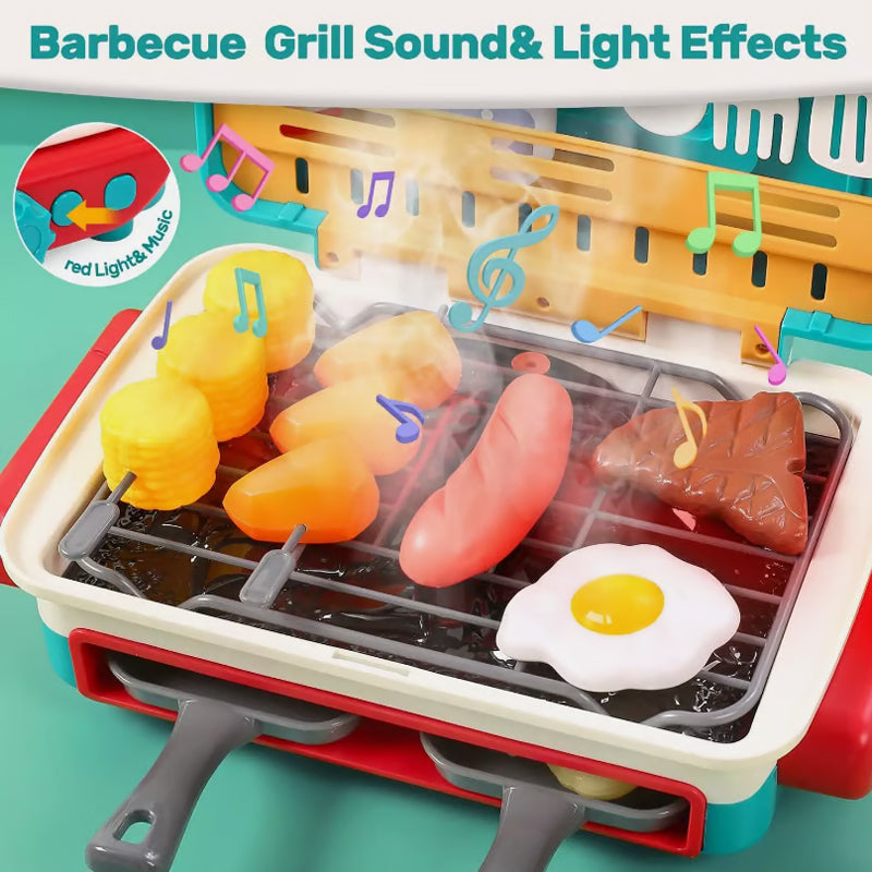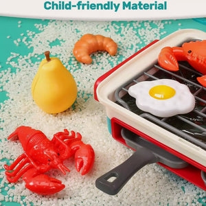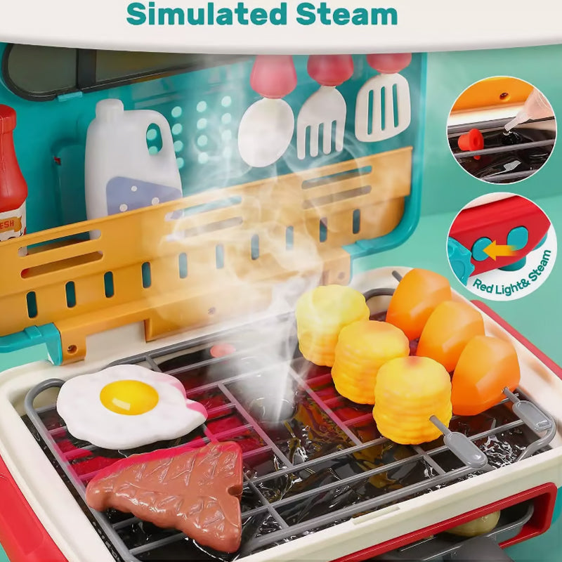 【Realistic Detail Design】Kids can put play food on the grill, just press "Purple Light& Music" button, which will present realistic lights and interesting music. Add appropriate amount of water, turn on the switch and the steam will come out.