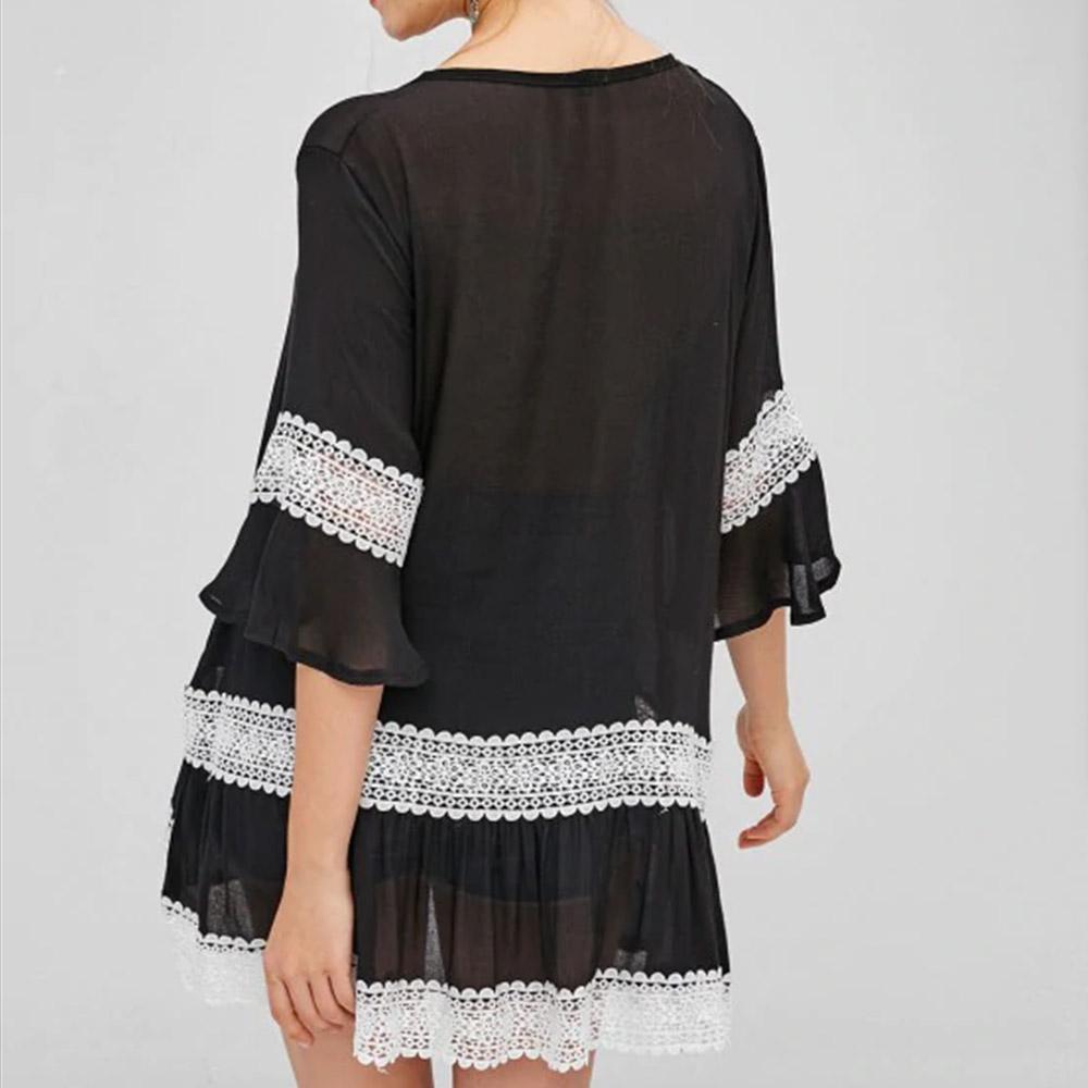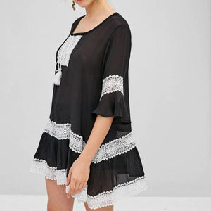 The Lace Panel Tunic Dress features a shift silhouette with a scoop collarline and lace panels. For timeless femininity, try it with open-toe sandals and a clutch bag.