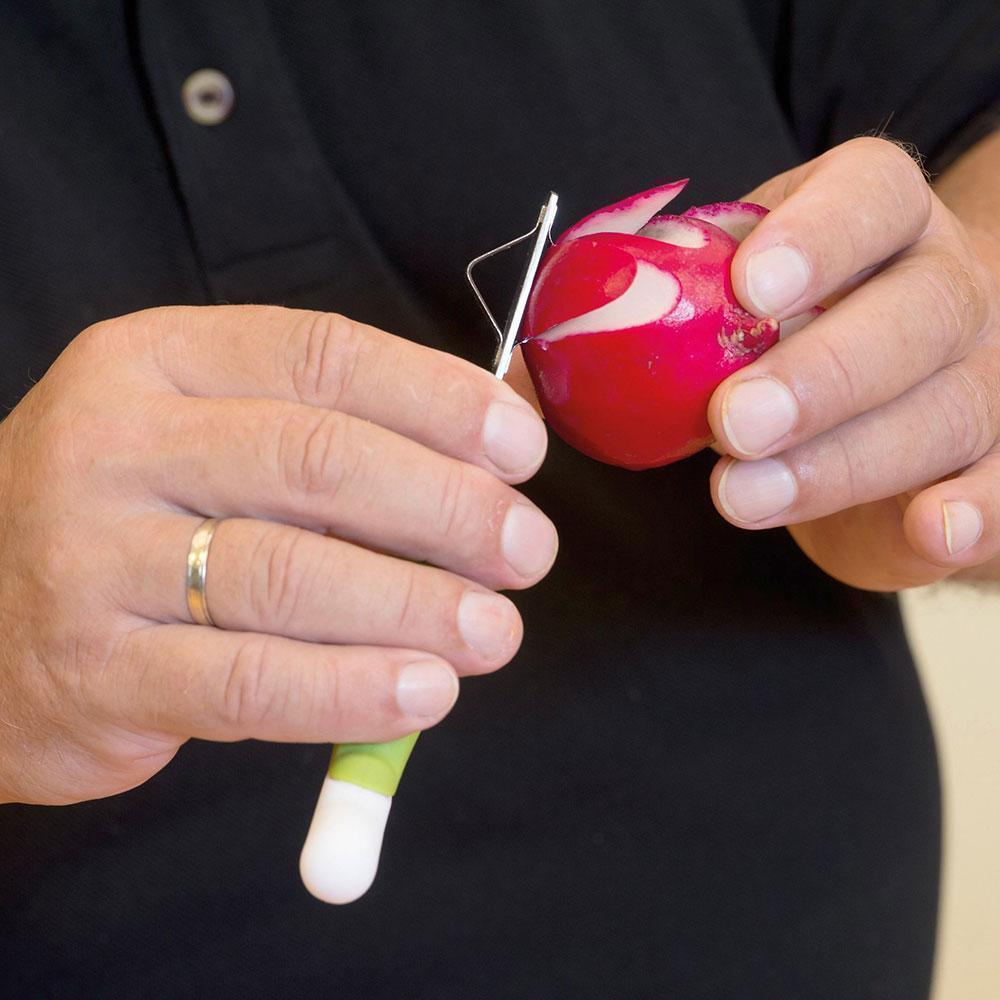 PEEL EVERYTHING -Serrated blade for peeling fruit and veg; Ceramic blade for slicing- thick or thin! Julienne blade for vegetable noodles or salads.
