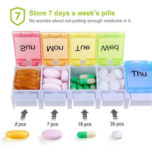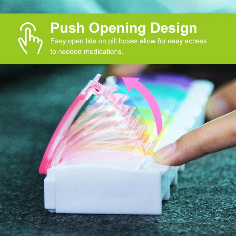 SPRING ASSISTED OPEN DESIGN. We use the latest design on this weekly pill organizer to achieve one-handed operation with the little rubber strips for the smart "lid spring open" feature. The lids are all beautifully colored and marked clearly with the date, everything is clear at a glance so you may find it easy to choose the pills you need. It's quite nice for easy daily dispensing and big enough to hold 8 fish oils or 12 large vitamins for each dose (size of each compartment: 1.3"x1.18"x0.82")