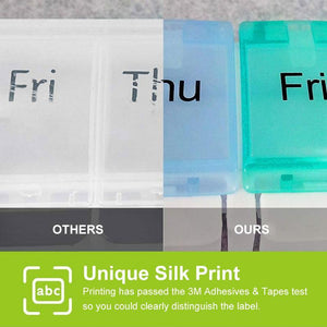 PREMIUM SCREEN PRINTING. To avoid screen-printing fonts and icons falling off from the surface of the pill box, we use high-end screen printing ink and strictly do the Ink Adhesion Test with 3M Tapes before shipment. Thus, no need to be frustrated with the missing fonts of "Tuesday" or icons of "PM", and worry about mistakenly taking the wrong tablets.