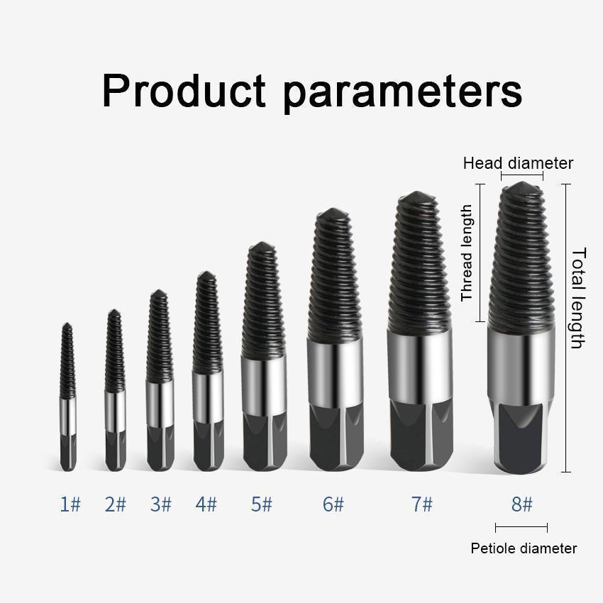 - Pipe Screw Extractor Set can adapt to various sizes, and can fix any type and size of pipes and screws.Screw extractor size includes #1 for 1/8"-5/32" , #2 for 5/32"-3/16", #3 for 3/16"-1/4", #4 for 1/4"-5/16", #5 for 5/16"-7/16", #6 for 7/16"-9/16", #7 for9/16"-3/4", #8 for 3/4"-1" .