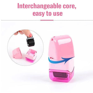 Self-inking roll stamp against identity theft with a special pattern to hide confidential information.