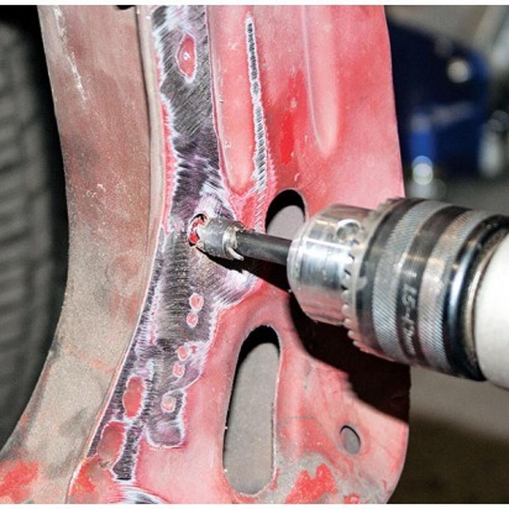 The spot weld drill cuts through existing spot welds and releases damaged panels. The mill cutter is suitable for drilling out spot welds on most vehicle panels including galvanized, boron, high-stress steels and allows the removal of the top panel only, leaving the back panel intact. The pilot pins ensure accurate cuts.