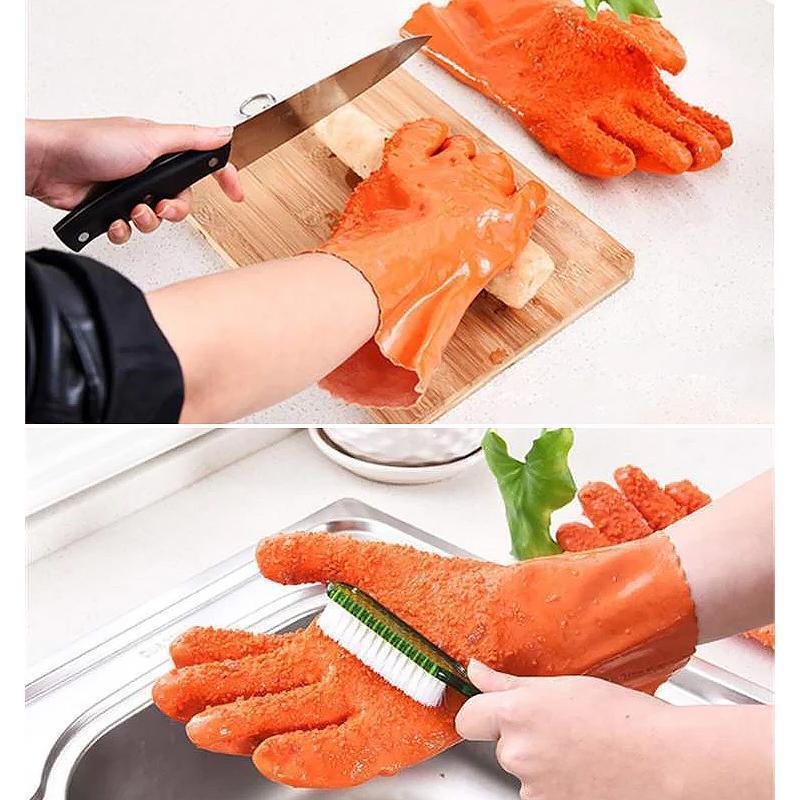 Not only do these amazing gloves peel veggies and fruits but they also can take the scales off fish! Wow! Feel free to clean and peel carrots, potatoes, yams, and more!